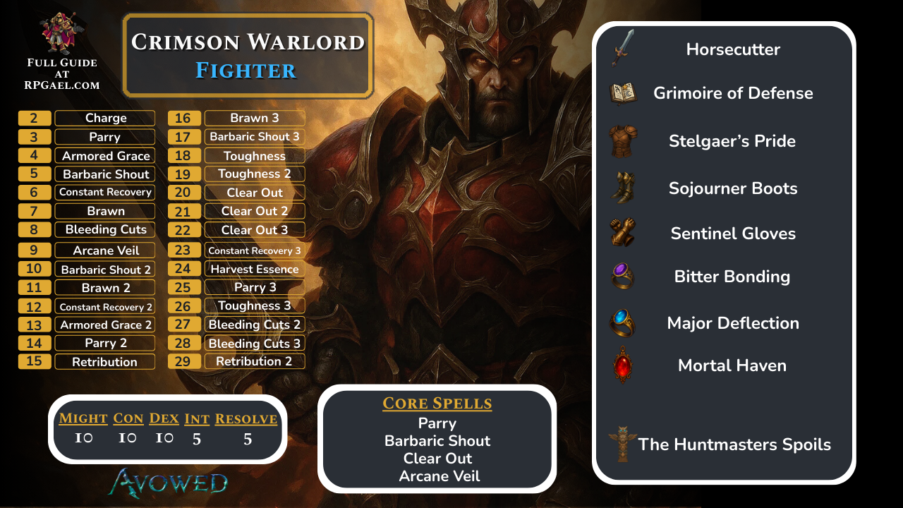 The Crimson Warlord turns you into a blood-soaked juggernaut that locks enemies in stun and bleed while you stand your ground and punish every swing. The core loop is simple and ruthless: stack Constitution to stay upright, add Might so every hit chunks, keep enough Resolve to parry on demand, then rotate a short set of tools that feed each other—Barbaric Shout to break momentum and shield up, Clear Out to rip space and pile on stun/bleed across a pack (or Flurry of Blows for single-target drain), and Arcane Veil as a near-free layer of damage reduction. Parry windows are your accelerator: a perfect parry into a counter counts as the combo finisher, amplifying stun and bleed and setting up takedowns. Played cleanly, this is a high-skill, high-reward brawler that controls the pace of every fight and snowballs safety from offense.