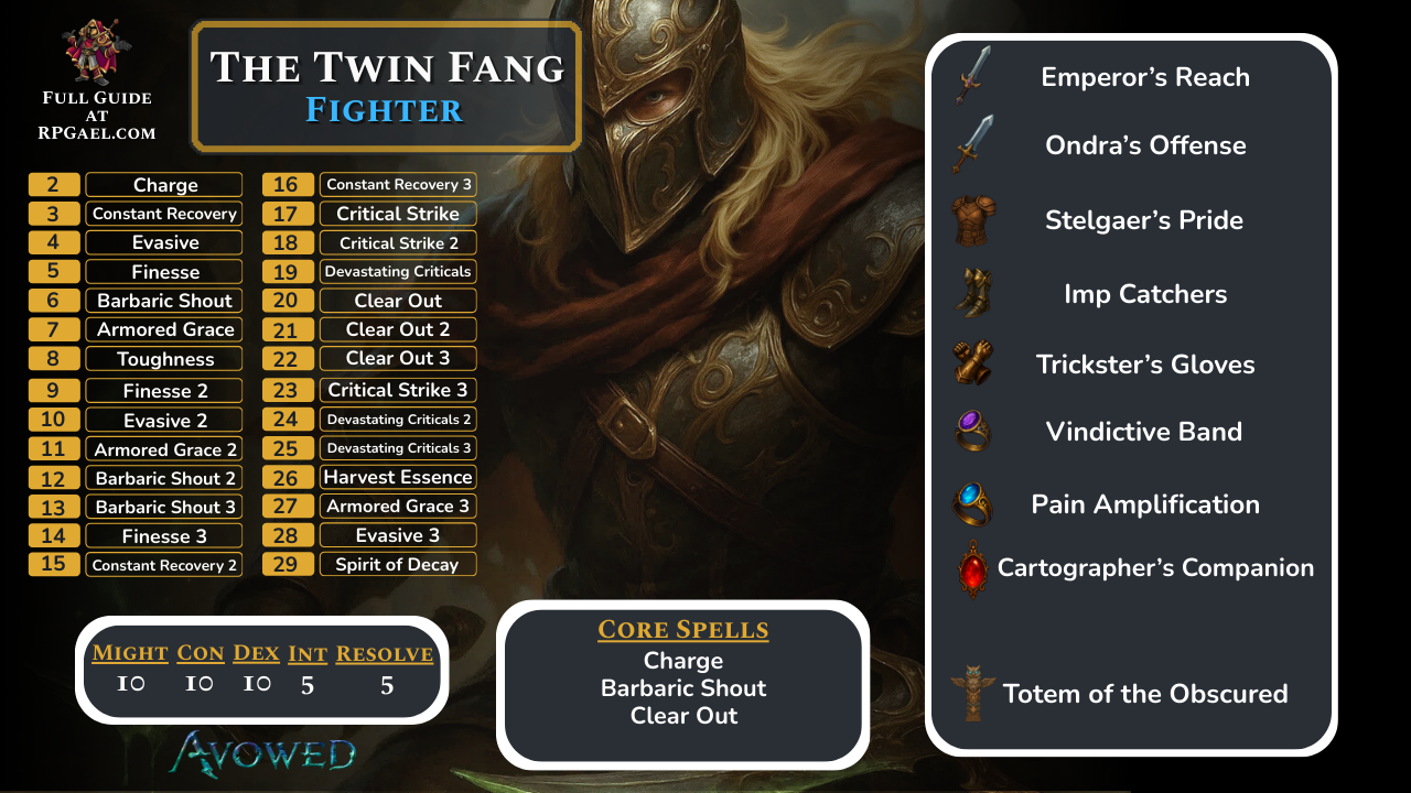 The Viper is a dual-wield assassin built around blistering speed, relentless crit chains, and stacking status to lock enemies down while you carve through them. Lean into Dexterity for attack speed, add Might so every swing hits like a truck, then round it out with Perception for crit rate and Resolve so your stamina never chokes your offense. Your core loop funnels foes into a stun–bleed–freeze blender: Barbaric Shout taunts and shields, Charge snaps you onto targets and knocks them off balance, and Clear Out erupts in three sweeping strikes that build accumulations and end in a knockdown. Pair that tempo with on-crit engines—totems and rings that add poison or frost—and your daggers turn every flurry into a status explosion that keeps packs helpless and bosses permanently under pressure.