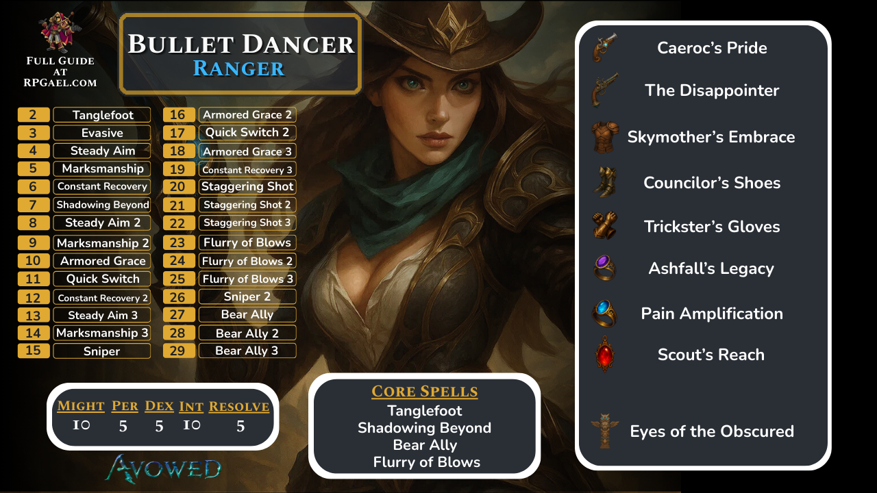 If you want to glide through fights like a gunslinging specter—appearing, deleting a target, and vanishing before the dust lands—the Bullet Dancer is your build. It’s a precision-first, speed-obsessed ranged package that chains slowed-time power shots, instant weapon swaps, and ruthless target selection to end encounters before they begin. The kit leans on Shadowing Beyond to reset or assassinate, Steady Aim to turn every pull of the trigger into a head-popping moment, and Quick Switch to dodge reload downtime by cycling between dual pistols and a devastating arquebus. With Tanglefoot to pin pursuers and a Bear Ally to soak aggro, you control the pace from the first muzzle flash to the last.