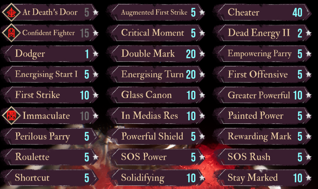 For Pictos use At Death’s Door, Confident Fighter and Immaculate. These will give you full critical chance and save you a bunch on Lumina cost.