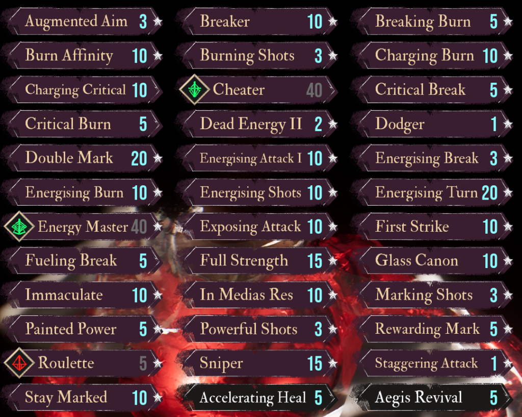 Contorso is the best weapon for this build. It has Agility scaling which allows Verso to move first in fights, 100% crit chance, lightning procs, and fast path to S rank. Chevalam is another great option if you just want to use something out of the box that does all of the work for you it starts at S, adds more damage, has Agility + Luck scaling, and Rush. It’s the old reliable weapon choice for Verso, you can pretty much just use this with Phantom Stars at the beginning of every fight to beat the game with your eyes closed.