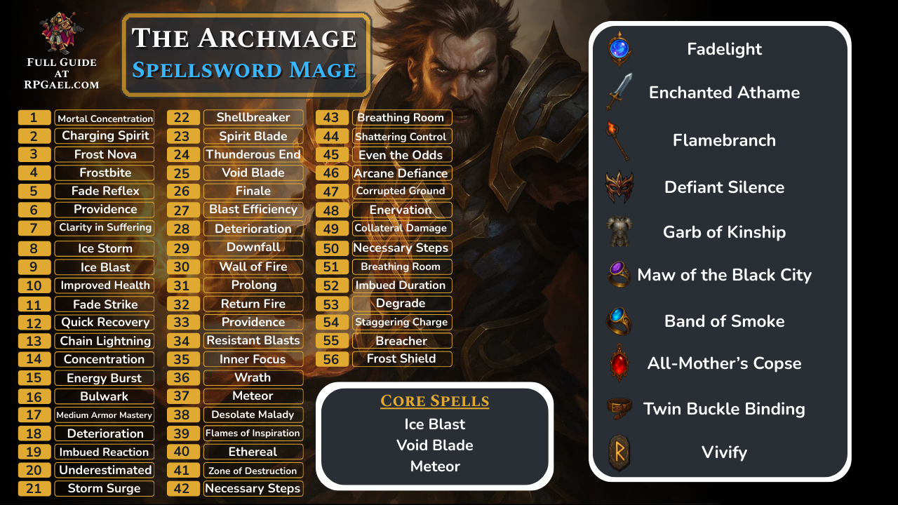 The Archmage is a spellblade mage that blends all elements into one devastating package. Where other builds might lean heavily into fire or frost, this one thrives on versatility—cycling through ice, lightning, and flame to exploit weaknesses and chain advantages. By late game, the Archon feels limitless: infinite spell chains, capped damage on core abilities, and sustain that keeps you standing no matter the encounter.