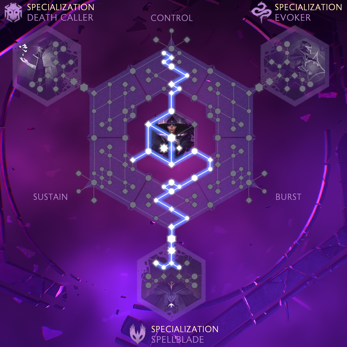The passive backbone is Blast Efficiency, which reduces the mana cost of blast spells and makes infinite chaining possible. From there, the advantage package (Flames of Inspiration, Resistant Blast, Zone of Destruction, and Imbued Duration) keeps you alive and supercharges your spells. Garb of Kinship makes these advantages even stronger, stacking healing and damage multipliers until you feel untouchable.