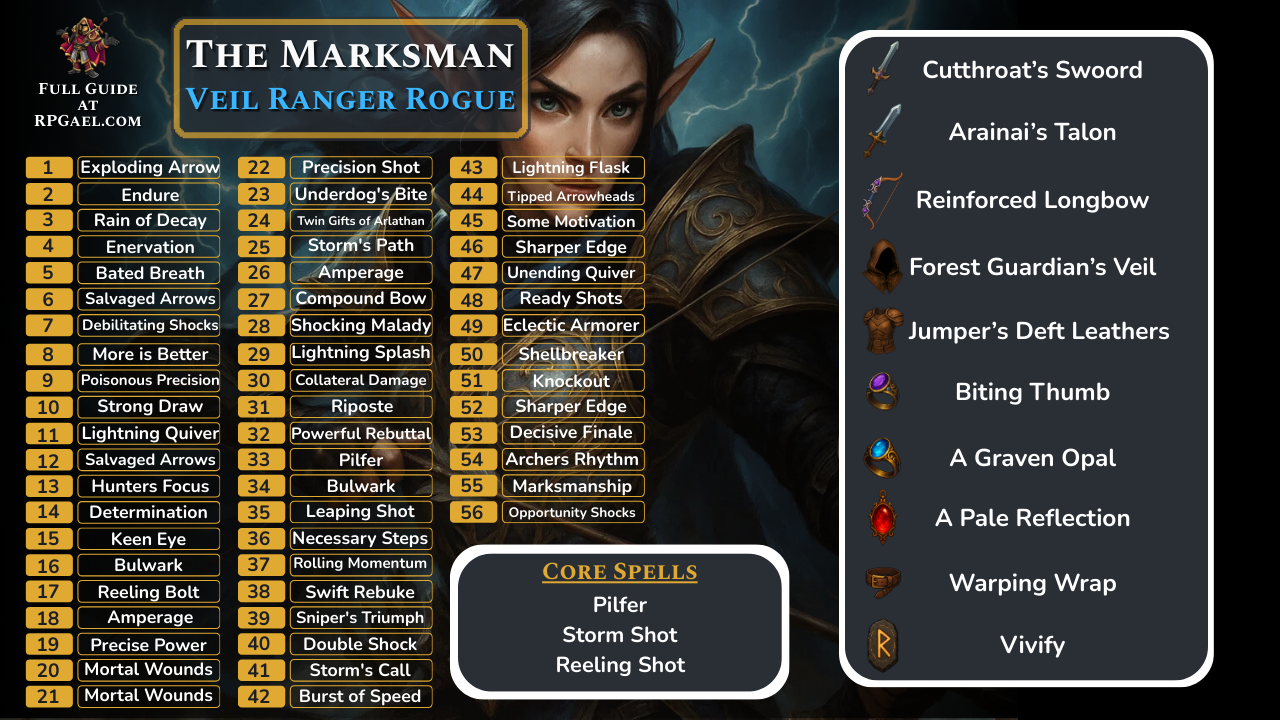 For armor and accessories, the theme remains consistent: stack critical and weak-point modifiers. The Forest Guardian’s Veil helmet amplifies weak-point hits further, which synergizes perfectly with the Reinforced Longbow. Jumper’s Deft Leathers serve as the best armor choice, enhancing ranged attack damage, charged shots, and defensive value while charging. The amulet Pale Reflection is excellent for this build because it ensures a permanent 20% damage boost against non-bosses and helps cycle ultimates quickly, letting you use Twin Gifts of Arlian more often. Rings should include Graven Opal for momentum generation and ranged scaling, and the Biting Thumb for raw damage against armored and barrier-heavy enemies. The belt slot is flexible, but Warping Wrap stands out for granting time dilation and precision when paired with Piler, giving you breathing room to charge arrows under pressure. Altogether, these pieces don’t just raise damage—they specifically enable the charged-shot sniper loop that defines the Veil Ranger.