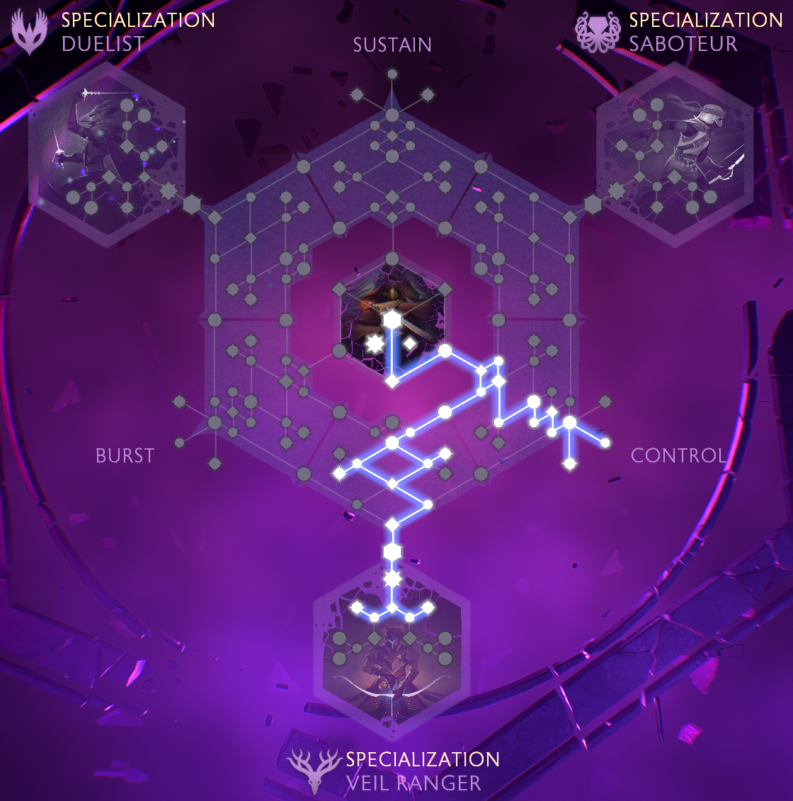 The real key to the Veil Ranger is chaining precision. Archer’s Rhythm rewards you for firing as soon as a shot is fully charged, significantly raising your damage ceiling. Hamstring gives you crowd control by dropping shielded or aggressive enemies to their knees with a leg shot, buying precious space for another charged arrow. Sniper’s Triumph is perhaps the strongest late-game synergy, rewarding weak-point hits with extra arrows, letting you chain shot after shot and ramp damage output to ridiculous levels. Combined with Rolling Momentum and Some Motivation, your quiver becomes a source of scaling DPS—every arrow fuels more arrows, every crit sets up the next.